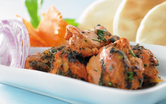 Chicken tikka masala is chicken tikka—chunks of boneless chicken marinated in spices and yogurt and then baked—in a masala sauce.